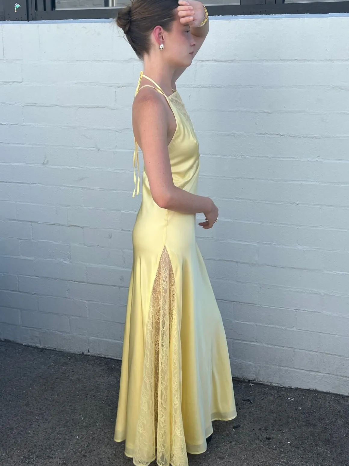 The Arie Lace Dress is an elegant maxi length gown. It features an ultra low v-neckline adorned with a lace insert, adjustable halter neck ties at the back and a full lining through the silk. The lace detailing runs along the sides of the dress from thigh to the hem. Farbicated with a sumptuous silk blend the Arie is a standout dress for a special occassion.