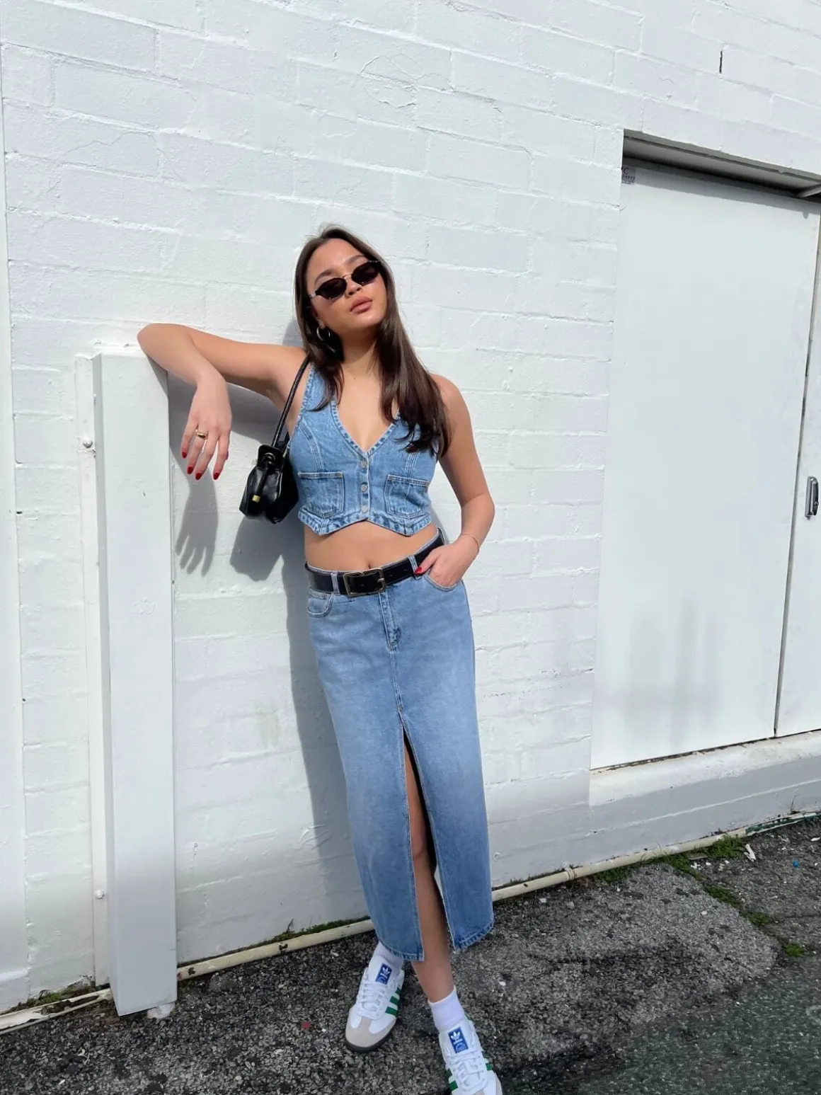 The 99 Low Maxi Skirt in Sylvie is a low rise maxi skirt designed with a front split in an easy light wash blue.