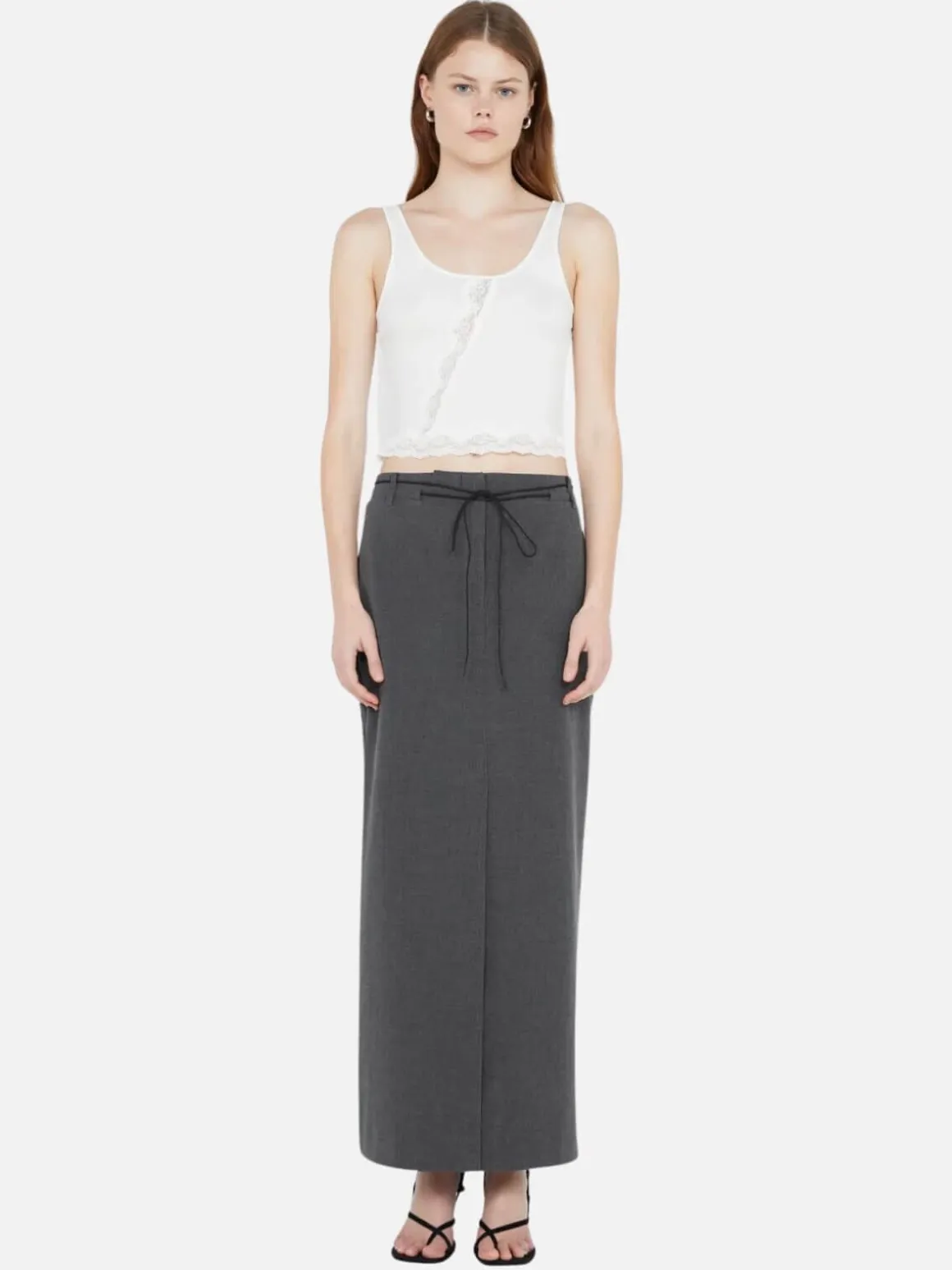 Crafted from comfortable cotton ribbed fabric, the BEC + BRIDGE Amyra Tank is an effortless and versatile top. It features a scoop neckline with a bound top edge and is detailed with a lace trim hemline. A diagonal lace trim runs through the front and back. Styled with BEC + BRIDGE Naida Panel Skirt. Available in black or white