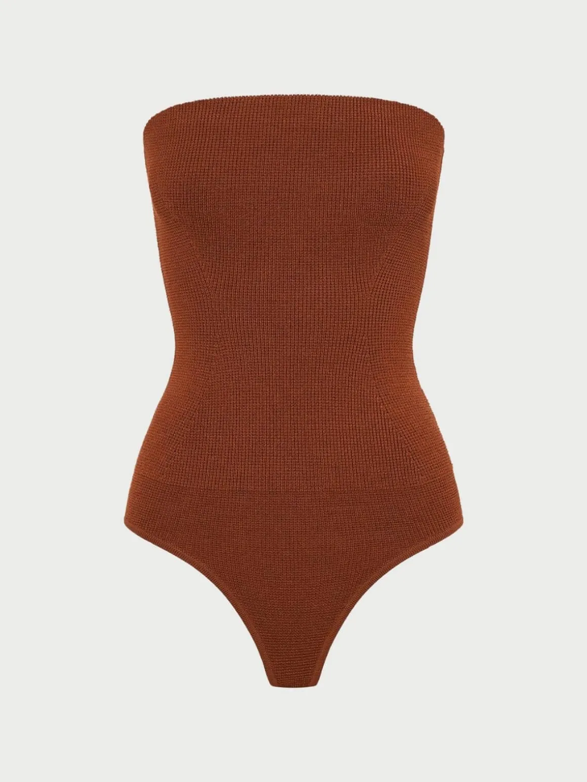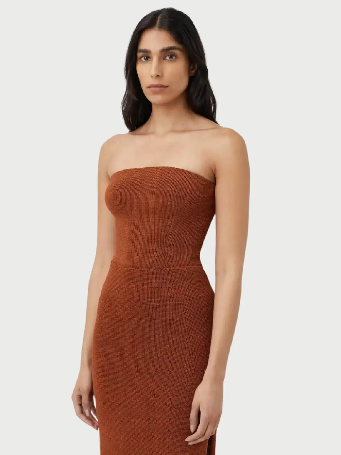 CAMILLA AND MARC Corbin Strapless Knit Bodysuit in Terracotta Brown.