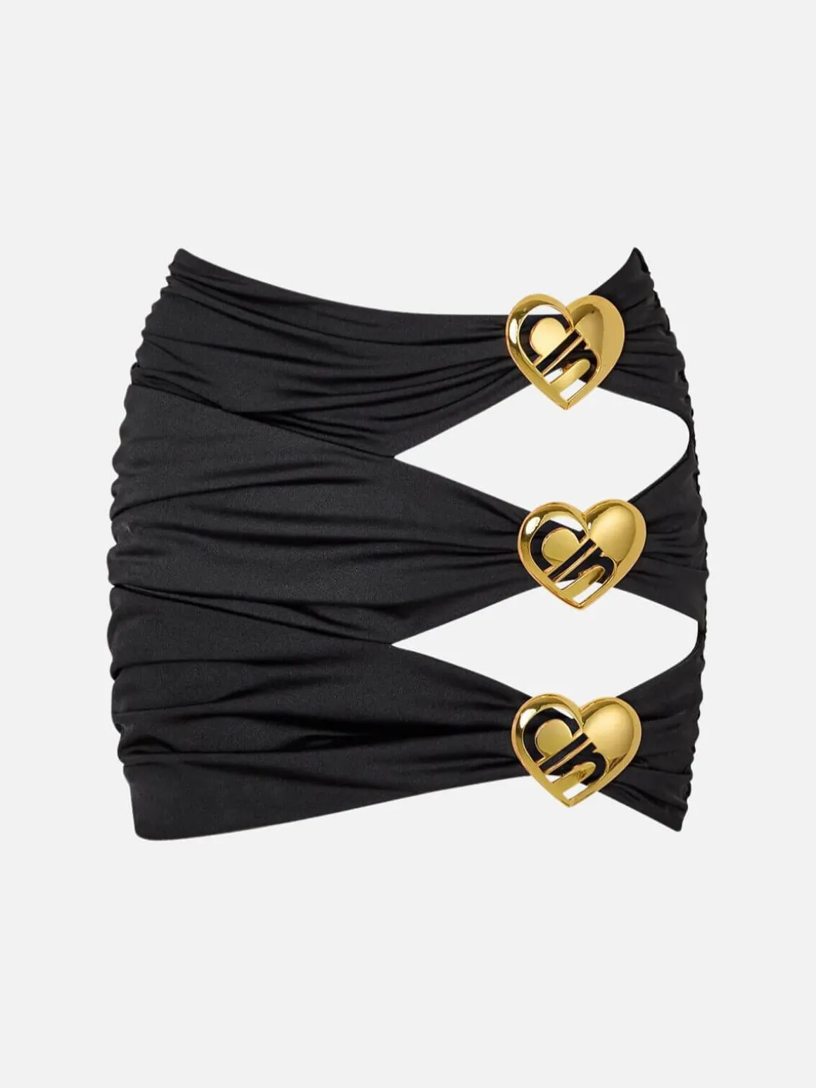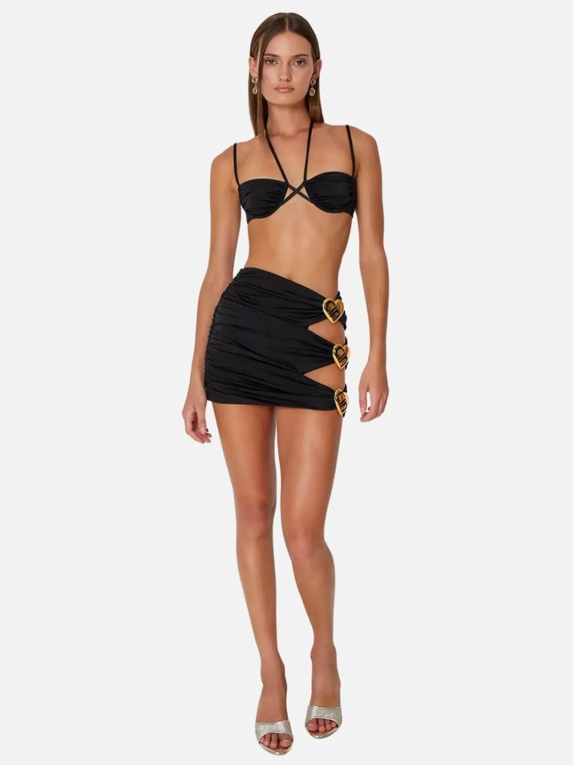 A best selling ‘it’ style of Summer, the Coupe skirt boasts party perfect gold jewel adornments atop lustrous double layered fabric.