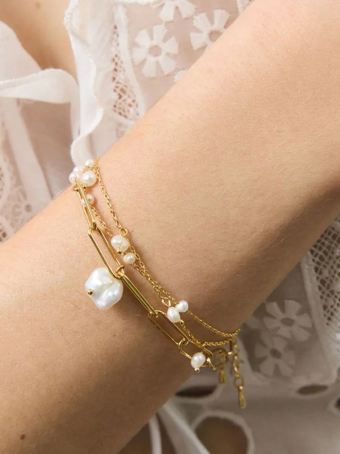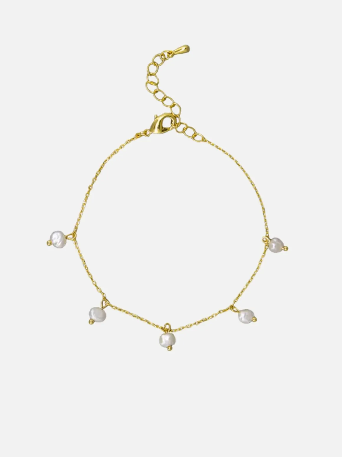 The Kendall Bracelet has five small freshwater pearls hanging off its intricate gold linked chain. A delicate style that is perfect for layering.