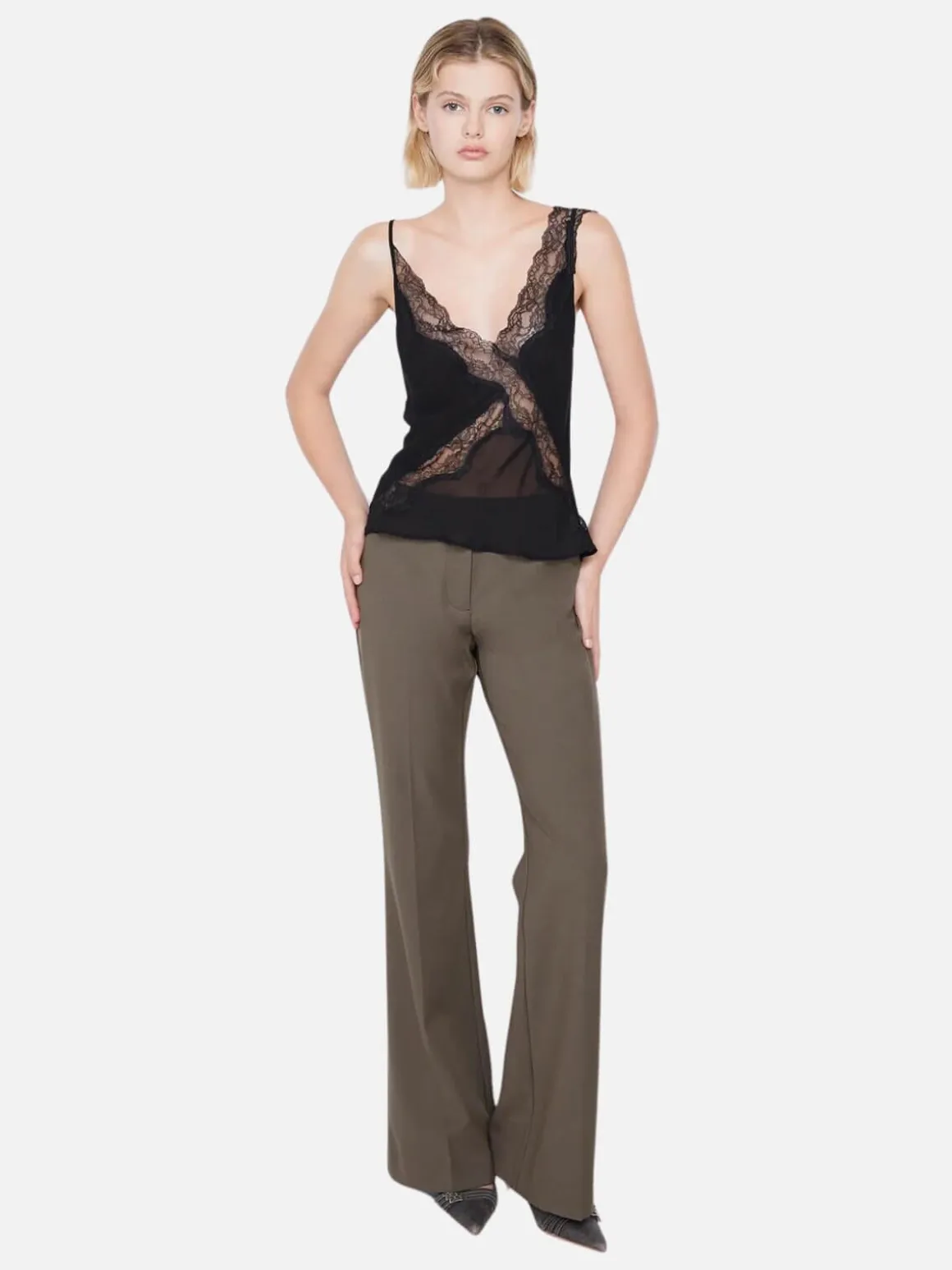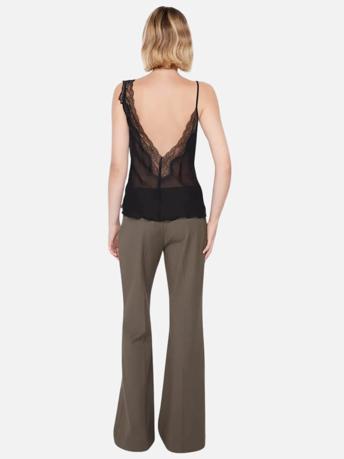 Crafted from a delicate silk fabric the BEC + BRIDGE Knox Cami features a captivating V neckline with exquisite lace cut-out details that diagonally overlap. Asymmetrical shoulder straps—one adorned with lace, the other a delicate rouleau—add a touch of intrigue. Detailed by a low back, trimmed with lace, the top is lined through the bust and sheer at the waist. Styled with BEC + BRIDGE Teri Bootleg Pant.