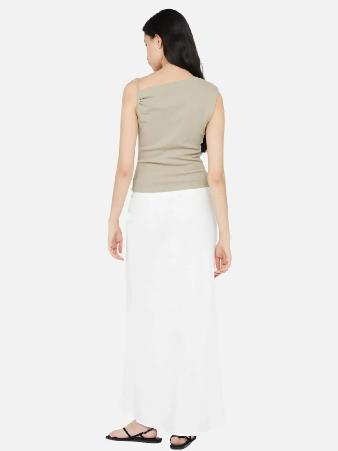 The BEC + BRIDGE Leila Asym Tank is the perfect work to weekend rib tank. Featuring an asymmetrical neckline, a draw tie shoulder strap, and tucks at the waist.