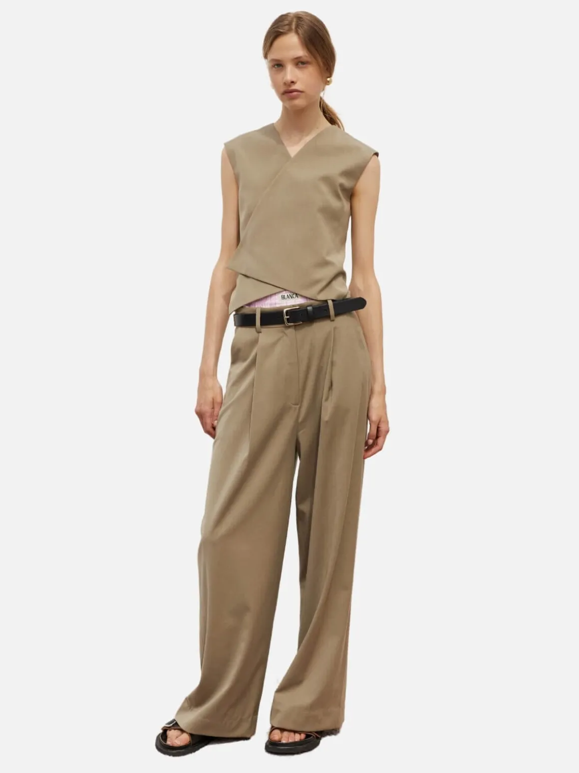 Sharp without the edges, sink into the slouchiness of the Marina Trousers in Beige. A workwear staple that comfortably transitions to the evening and the couch, this pair of wide leg trousers boasts a pleated front, belt loops and a *dangerously* relaxed feel. Up the put-together confidence and wear it with the Marina Vest – deliriously comfortable and so zero-thought that it (almost) shouldn’t be allowed.