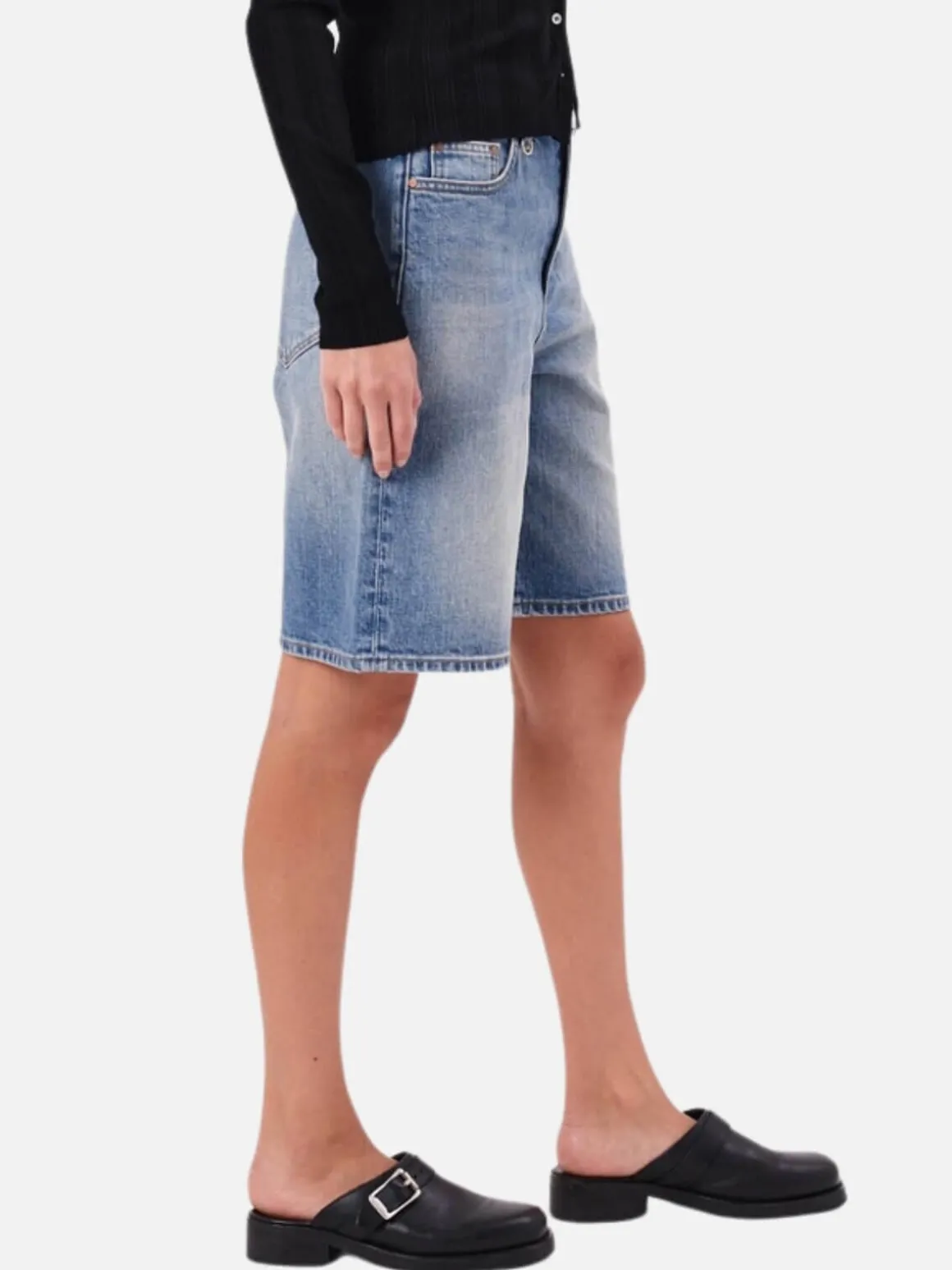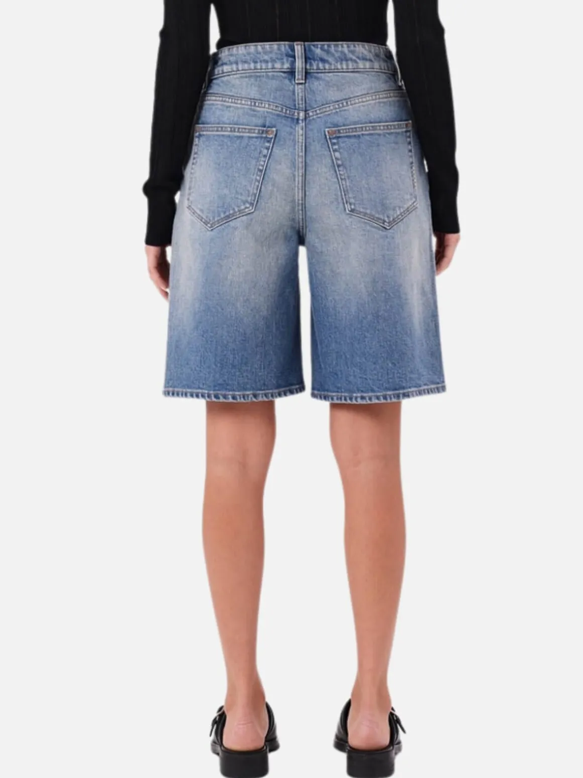 - A mid-high rise cut to an oversized knee-length that widens towards the hem