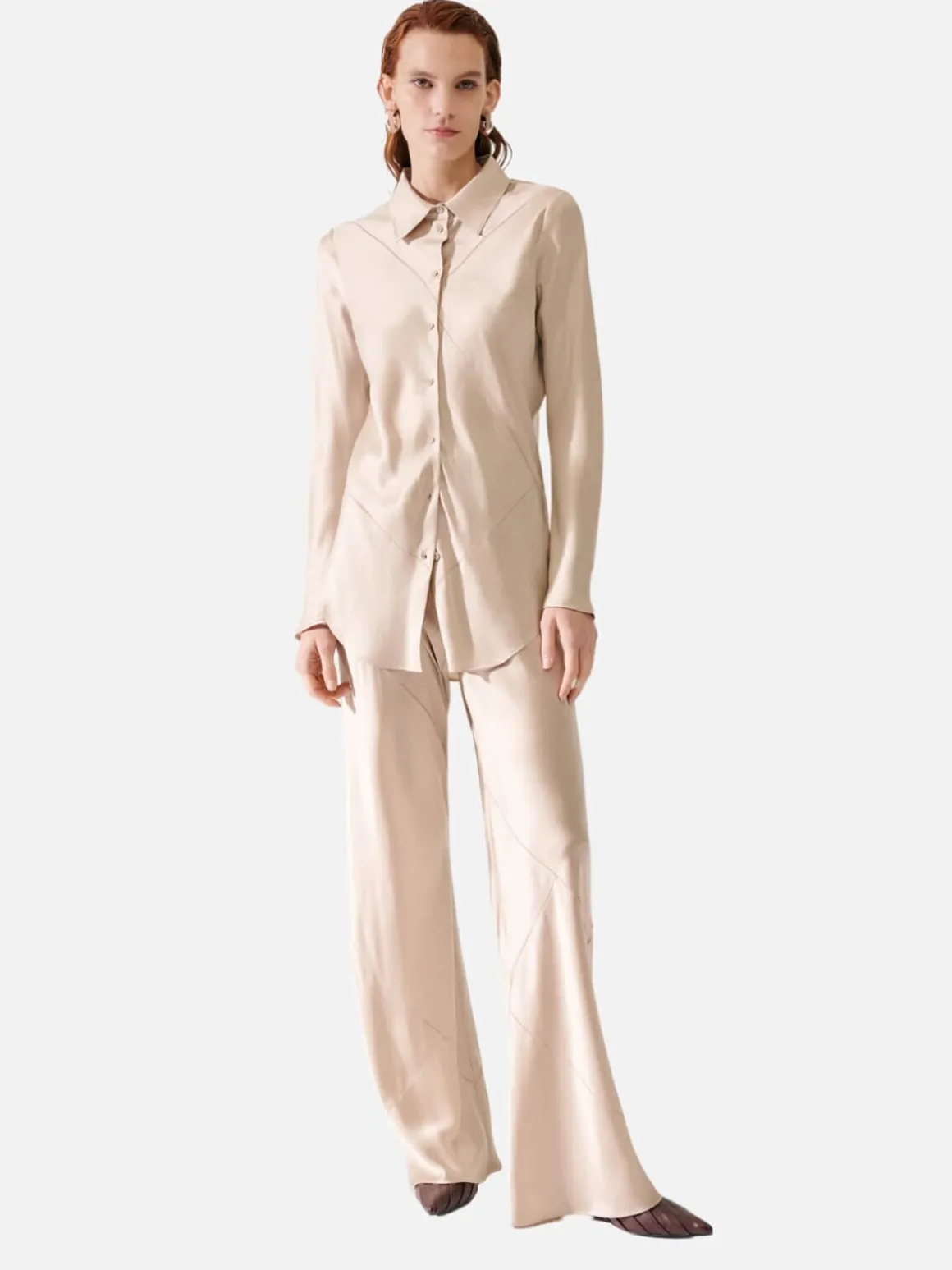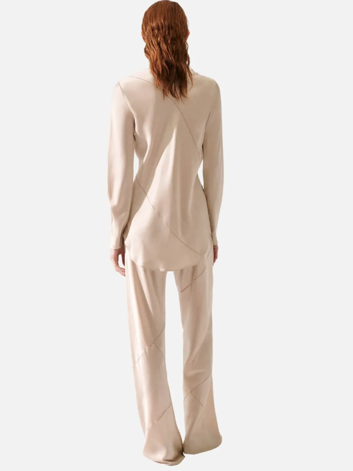 Silk Laundry’s Bias Cut Shirt offers a semi-fitted silhouette with a button-down front and a matte sheen, enhancing its subtle style. Cut on the bias for a considered, pragmatic fit.