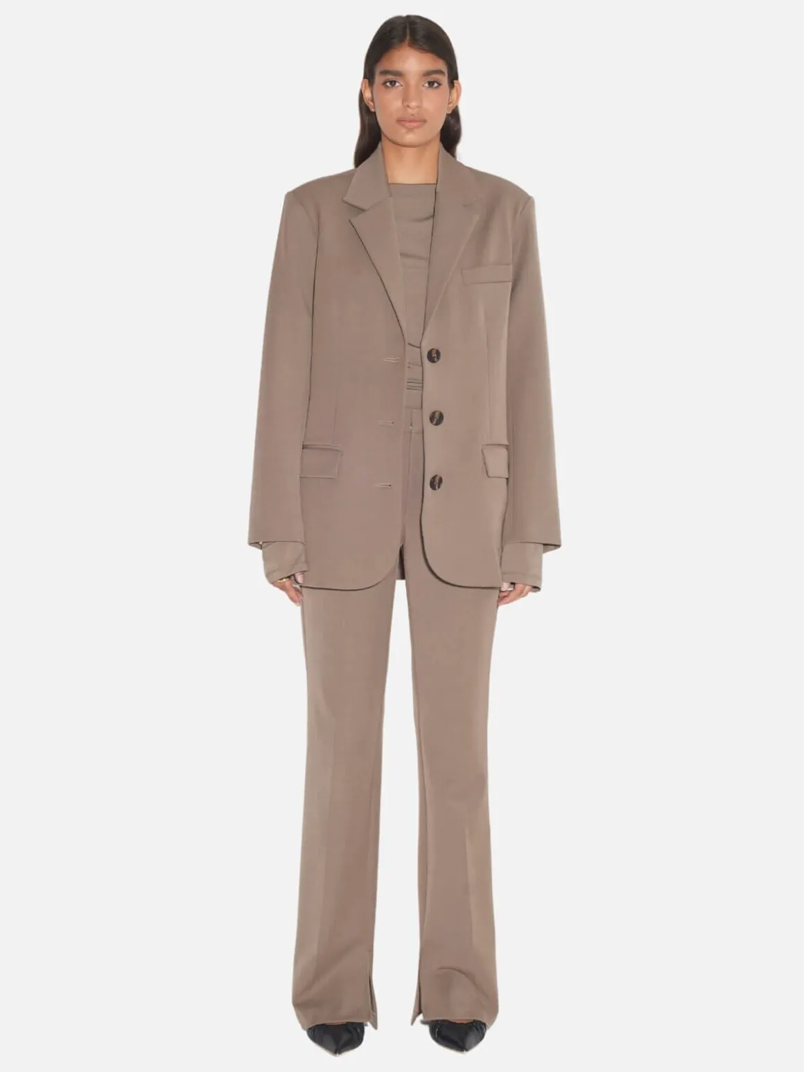 The Uma Tailored Suit Pant is our new suit pant design. The longline pant features a split detail on the inside seam of the ankle, non functional back pockets, a hook and bar clasp closure and zipper for entry and detailed waistband. Fabricated in a stretch ponti-like suiting makes them the perfect pant to look stylish whilst on the go. Bonus – this fabric won’t crease. Pair with The Tyrell Jersey Top for an elevated monochrome look.