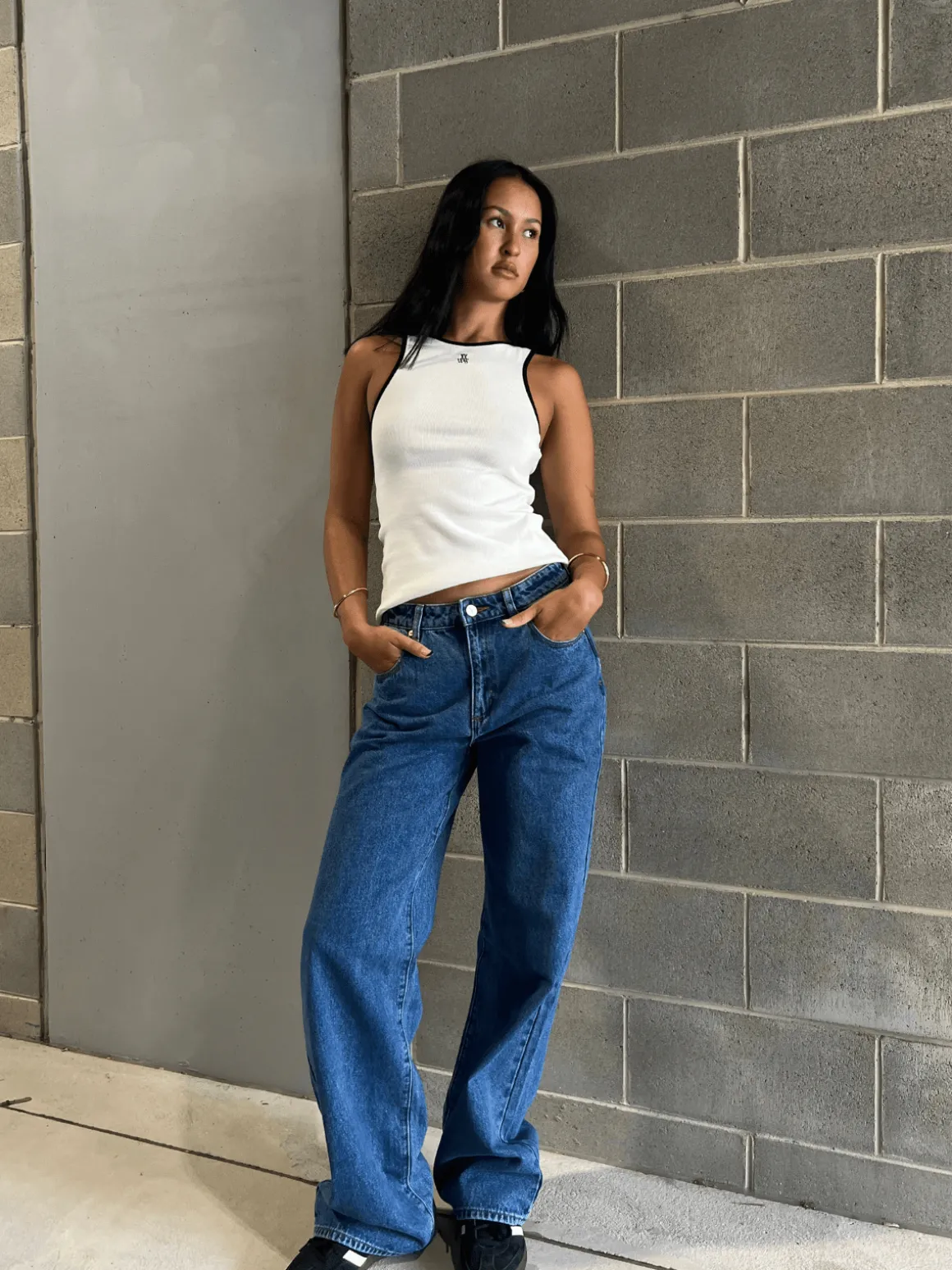 Introducing the VWXX Tank, showcasing our bespoke 20 year anniversary logo. This limited edition black tank is crafted in our signature 2×2 cotton rib and finished with ivory contrast bind. This high neck tank is designed to be worn as a first layer or on its own with V&W denim for everyday wear.